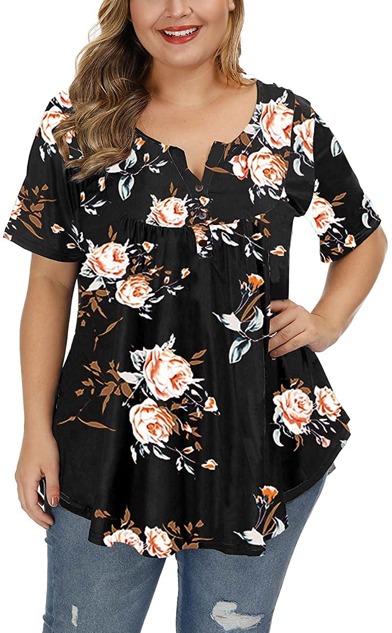 NYXBERRYT Allegrace Women's Plus Size Floral Blouses Henley V Neck Button Up Tunic Tops Ruffle Flowy Short Sleeve T Shirts, Size: Small, Other