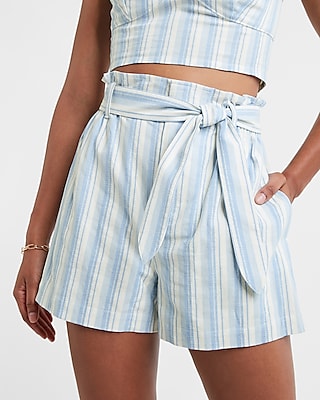 Striped Paper Bag Waist Belted Shorts